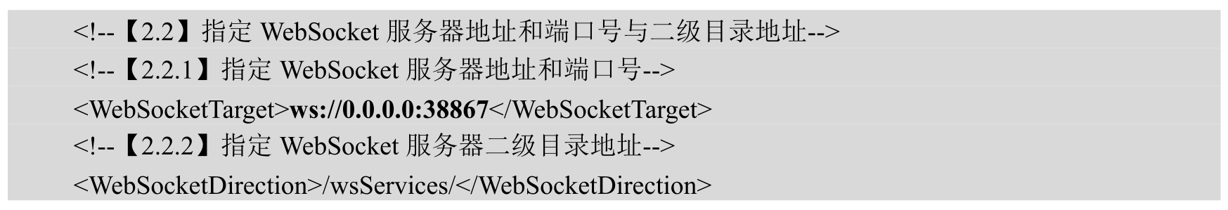 WebSocketTarget 键值表示 CS-Monitor 的 WebSocket 连接的服务器地址和端口号。WebSocketDirection键值表示WebSocket服务器二级目录地址,例如,使用服务器的38867端口作为WebSocket服务时,设置WebSocketTarget键值为“ws://0.0.0.0:38867”,并且设置WebSocket 访问的二级目录为“/wsServices/”,需要设置 WebSocketDirection 键值为“/wsServices/”,同样需要测试该端口是否被占用。