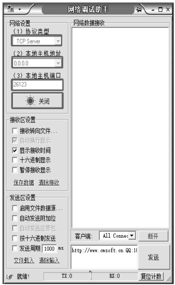 (2)将程序页面的“(1)协议类型”选择为“TCP Server”协议,“(2)本地主机地址”选择为“0.0.0.0”,在“(3)本地主机端口”中输入“26123”(该端口号为CS-Monitor程序默认的侦听端口号)。输入完成之后,单击“连接”按钮,将会出现如图6-2所示的页面,“连接”按钮会变为“关闭”按钮。至此,就成功地在服务器端开启了侦听服务。