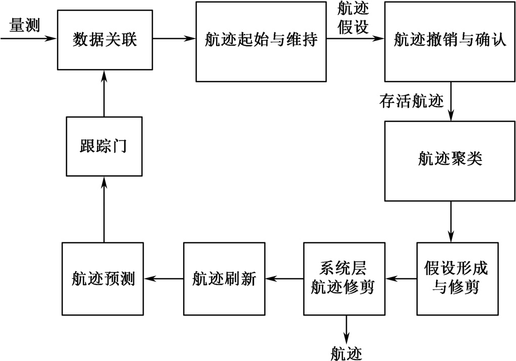 MHT的流程可以大体分为两个步骤:数据关联以及航迹维护,如图2.1所示。数据关联是将读入的扫描数据按照其所处的波门和已有的航迹进行关联,要求把所有落在波门内的扫描数据和相应的航迹都关联起来,暂时不考虑航迹的质量。需要注意,某个数据和其对应的航迹关联起来,并不等于说该数据就是这个航迹中目标的新观测数据,该数据可能是虚警,该数据也可能是一个新目标的起始,这些问题的最终确定需要等到航迹维护时进行。这反映了MHT的基本思想:把困难的数据关联操作推后,等到获取更多的观测数据后再进行。如果扫描数据没有落在任何一个波门内,则该数据直接产生一个新的航迹。另外,如果在航迹的波门内没有观测数据,则利用预测技术将航迹外推,并形成新的波门。