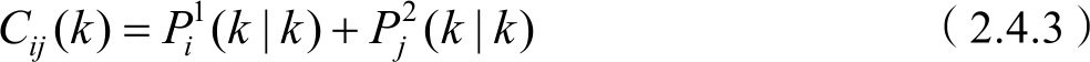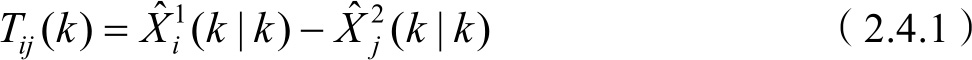 为了描述问题的方便,假设送至融合中心的所有状态估计都经过时空对准。令来自节点1的点迹 i 和来自节点2的融合航迹 j 在 k 时刻的状态估计之差为