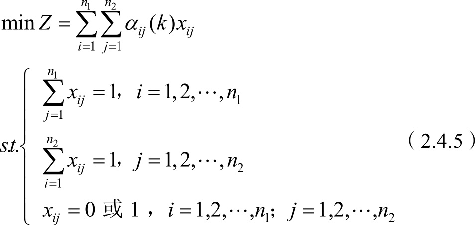 对该矩阵进行最优分配,便可得到 k 时刻的可能点迹融合航迹关联对,分配原则为: