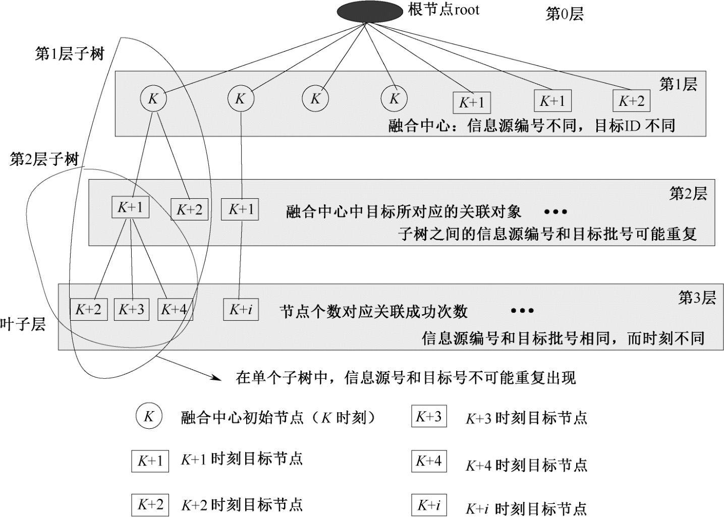 假设树作为一棵树,树的根节点是整个数据集合空间,每个节点对应一个关联假设,每个叶节点是属于单一类别的记录,其结构模型如图2.19所示。假设树的深度为4,第0层为根节点;第1层节点表示融合中心航迹库,包括初始航迹和新航迹,目标的ID唯一,信息源编号唯一;第2层每个节点表示被关联目标与融合中心的一种关联假设,同一层的节点之间的信息源编号和目标号可能重复,但每个时刻该层各个节点的信息源编号唯一;第3层节点是叶子,对应第2层每个节点在本层都有几个分支,即叶子,属于同一父节点的叶子,其信息源编号和目标批号相同,而时刻不同,叶子个数对应关联成功次数。