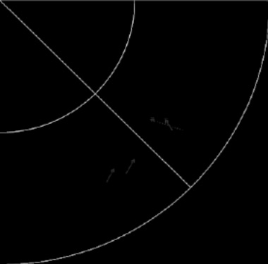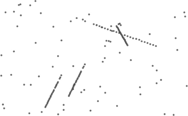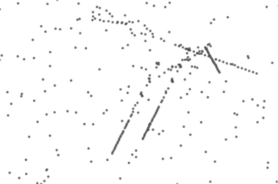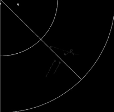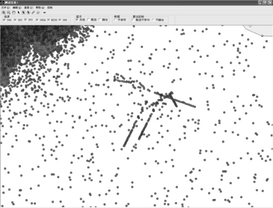 利用多部国产雷达模拟器的试验数据,模拟不同精度、不同更新率的多传感器点迹数据,对基于多假设树的点迹融合算法进行实验验证,点迹分布态势如图2.23所示,具体考核算法在目标平行、交叉和转弯时的点迹关联能力。在第242s时,对目标作平行运动和交叉运动的点迹分布态势和点迹融合态势如图2.24、图2.25所示;在第596s时,对目标的3个典型运动场景的点迹分布态势和点迹融合态势如图2.26、图2.27所示。从实验结果可以看出:本算法具有较好的适应性,基于多假设树的点迹融合算法利用点迹的各种特征信息和融合航迹历史累积信息来提高关联的正确性,杂波点迹的假设关联权重较小,其所在的分枝在假设树的管理中不断被修剪掉,避免了错关联的产生。同时,算法具有较好的实效性,短时间内就能得到较高的正确关联率。在态势图的左上角部分为障碍物产生的杂波点迹,即使是多假设方法也无法区分出真目标和杂波,这种情况一般作屏蔽处理。
