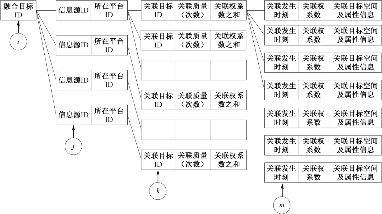 根据假设树的结构模型,设计了一个假设树的数据结构,定义了假设树各层的关联关系、各层节点的数据字段,如图2.22所示。图中,第 i 层为融合目标,其唯一标识符为融合目标ID;第 j 层为与融合目标关联的信息源,其唯一标识符为信息源ID,所在平台号ID作为一个字段;第 k 层为与融合目标关联的信息源目标,其唯一标识符为关联目标ID,关联质量( Fom )和关联权系数之和在关联过程中实时更新,该层属于同一信息源的不同关联目标ID集合;第 m 层为同一探测目标按时间顺序保留一定长度的数据集合,其唯一标识符为关联时刻,同时记录了该时刻的关联权系数和关联目标空间及属性信息。