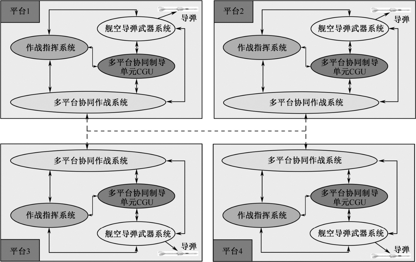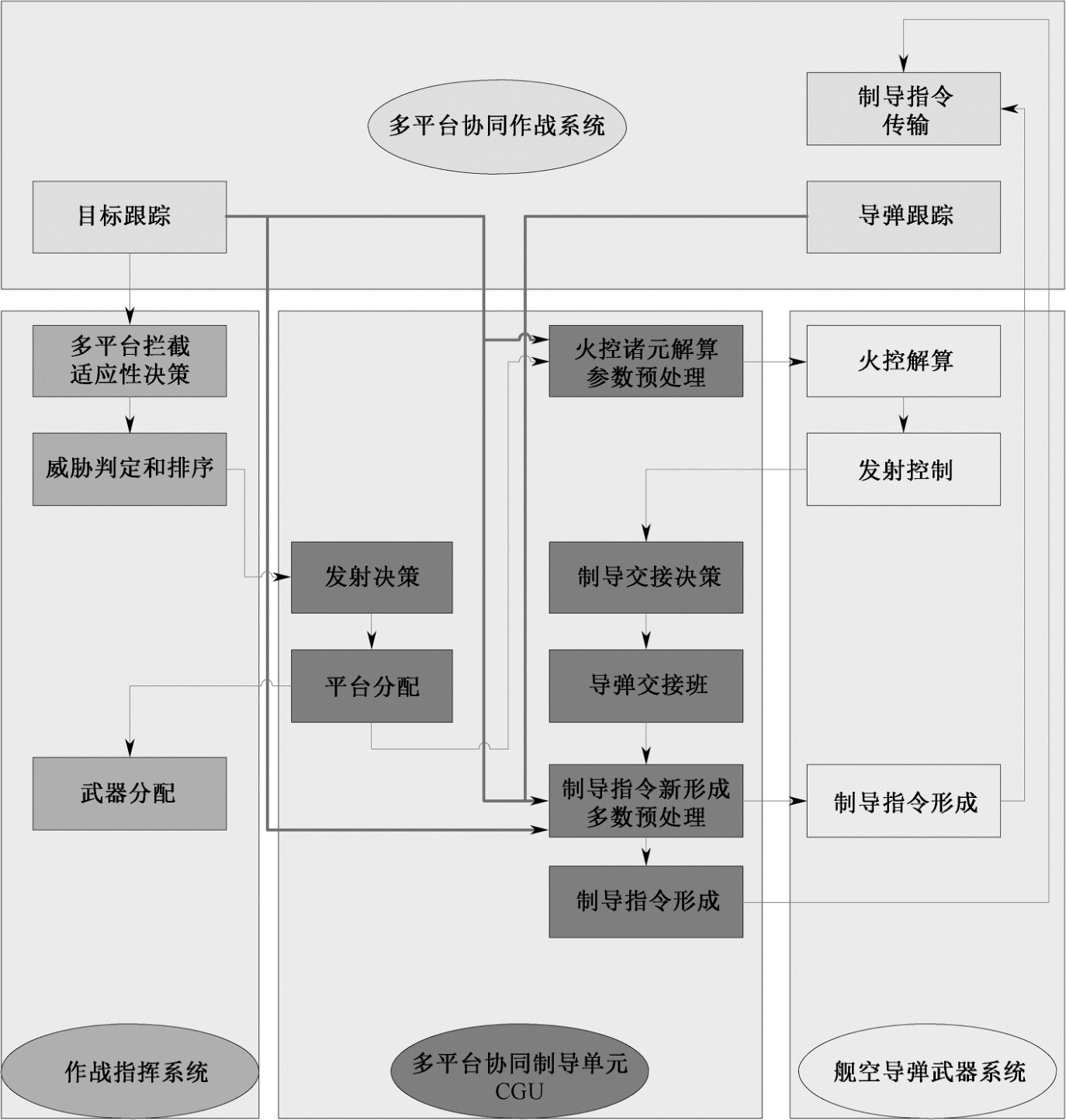 各协同平台通过多平台协同作战系统实现目标和导弹跟踪数据共享;在此基础上,根据战场态势,平台上的作战指挥系统与多平台协同制导单元CGU进行信息交互,经过多平台协同决策后,完成平台在协同制导过程中的任务分配,划分发射平台及协同交接平台,确定制导交接时机;发射平台中的CGU系统与舰空导弹武器系统进行信息交互,完成火控诸元求解、导弹发射及初始控制等任务;协同交接平台中的CGU系统通过多平台协同作战系统实现交接参数交互,完成导弹协同交接任务,控制舰空导弹飞行,直至实现中末制导交班。