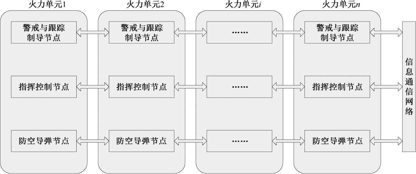 (2)无中心节点。作战单元级指控中心可根据作战态势和需求由火力单元级指控中心代替;同时,各种设备之间在作战时没有固定的隶属关系,对某个目标进行拦截时,可根据目标、战场环境、使用战术及部署情况,将制导设备和防空导弹发射装置随时组合为具有临时隶属关系的作战结构。