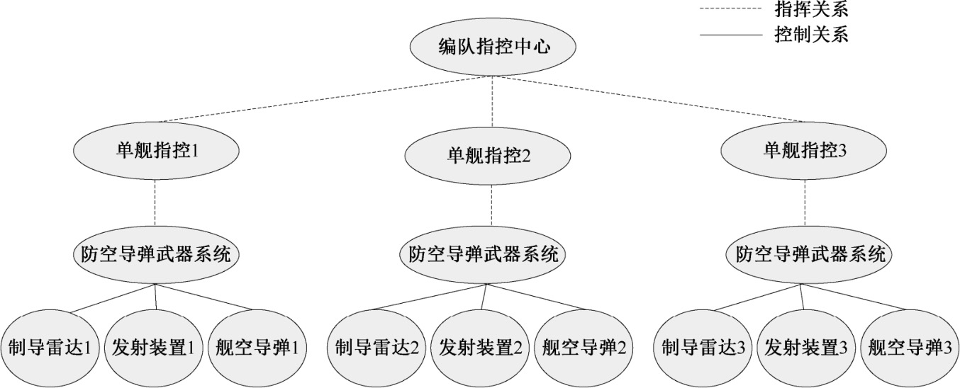 区域防空作战的基本原则是“集中指挥、分散控制”,上层的防空指挥机构主要是掌握总的空情、态势,确定原则和分配任务,而作战任务的执行控制则需要武器的指挥控制系统来实施。因此,舰空导弹网络化协同中指挥控制节点可从功能上分为两个层次:部队指挥层次和武器控制层次。
