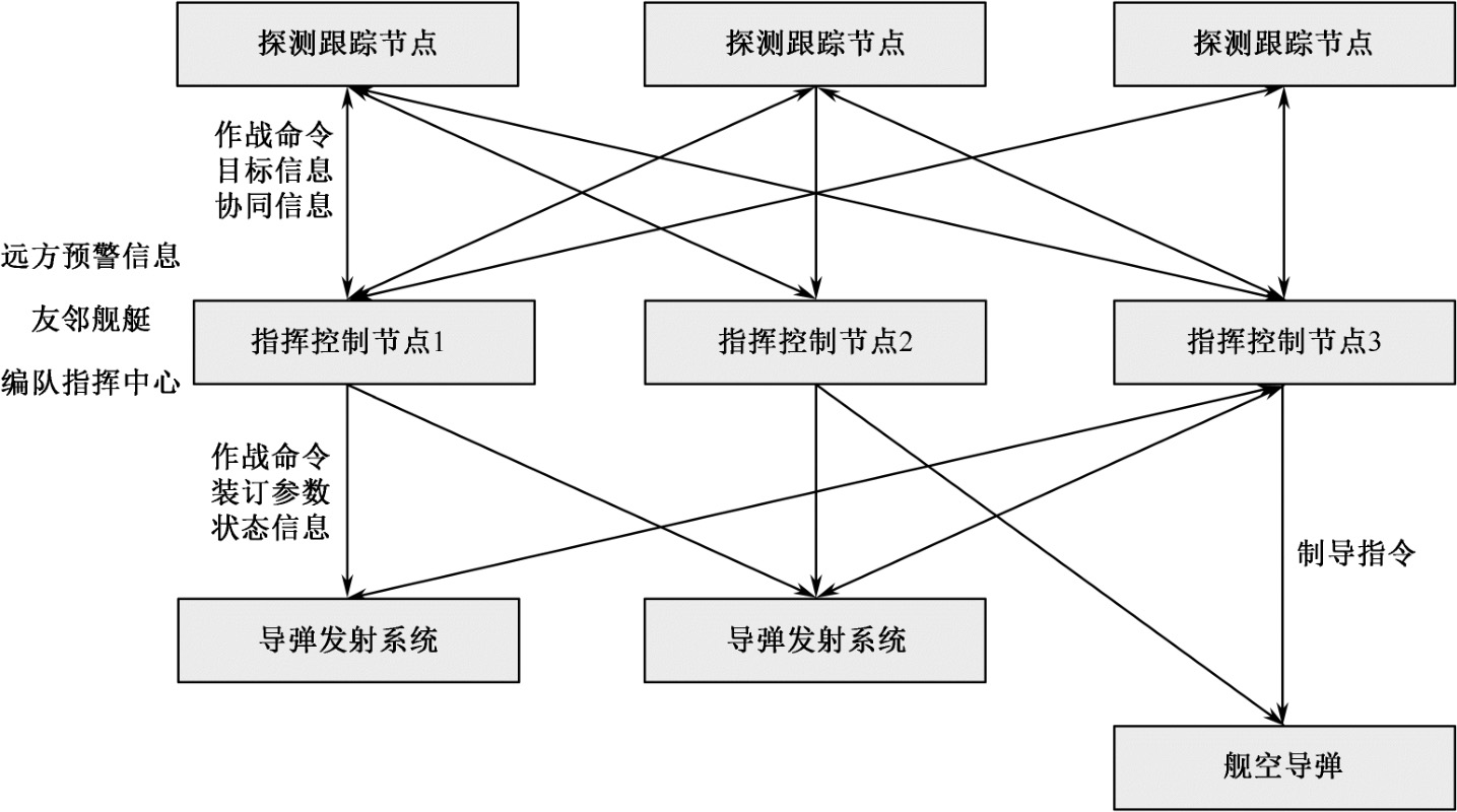 从微观角度看,各火力单元仍然存在,不同的是将传统火力单元按照功能分解为:警戒与跟踪制导节点、指挥控制节点和防空导弹节点。将这些节点分类联网,形成网络化的舰空导弹武器系统。各功能节点之间的关系和舰空导弹武器控制系统连接关系如图1.5和图1.6所示。