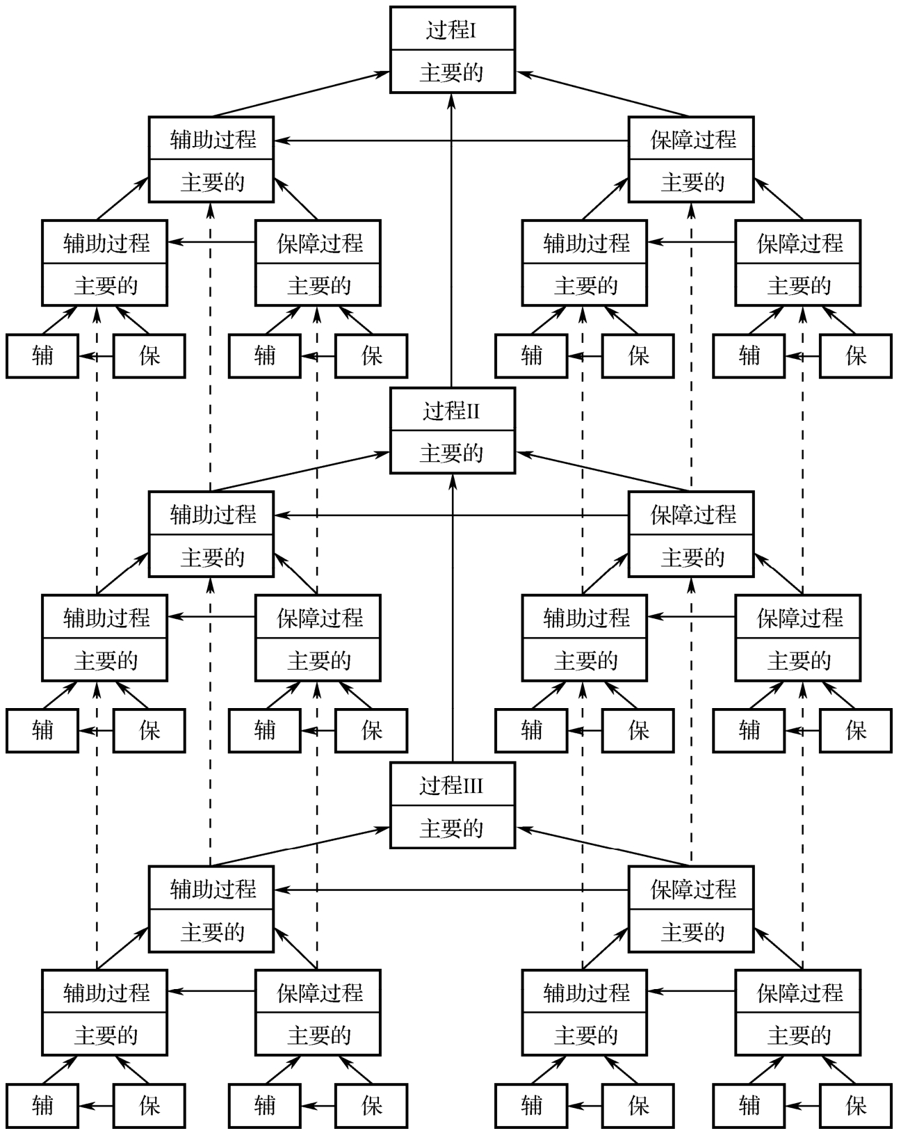 从图 1-4 中可以看出,第一级别的辅助过程和保障过程在自己的子系统中被看成主要过程。同时它们也有自己的辅助过程和保障过程,以这些辅助过程和保障过程为中心,又构成了新子系统的主要过程,使系统在水平方向也出现了分支。
