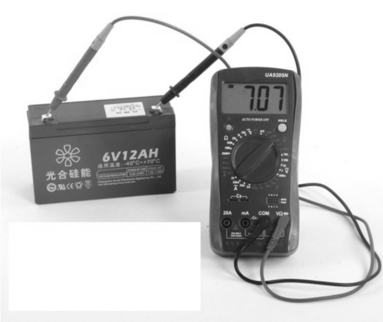 静态是指电动自行车不接收信号(或只是启动,不运行)条件下的电路工作状态,其工作电压即静态电压。测量静态直流电压一般用来检查电源电路的整流和稳压输出电压、各级电路的供电电压、晶体管各极电压及集成电路各引脚电压等来判断故障。因为这些电压是判断电路工作状态是否正常的重要依据。将所测得的电压与正常工作电压进行比较,根据误差电压的大小,就可判断出故障电路或故障元件。例如,用万用表测量蓄电池的电压就是静态直流电压,如图3-2 所示。