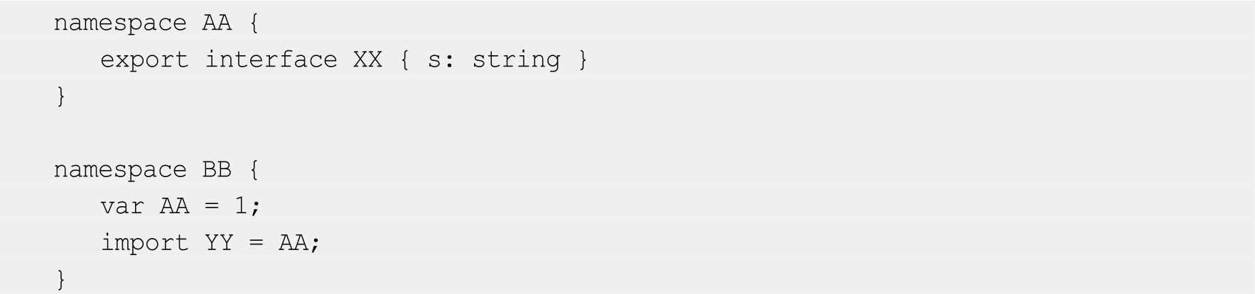 YY是非实例化命名空间AA的本地别名。如果更改AA的声明,使得AA成为实例化的命名空间(例如,通过在AA中包含变量声明),则BB中的import语句将是一个错误,因为表达式AA不是引用命名空间AA的命名空间实例。