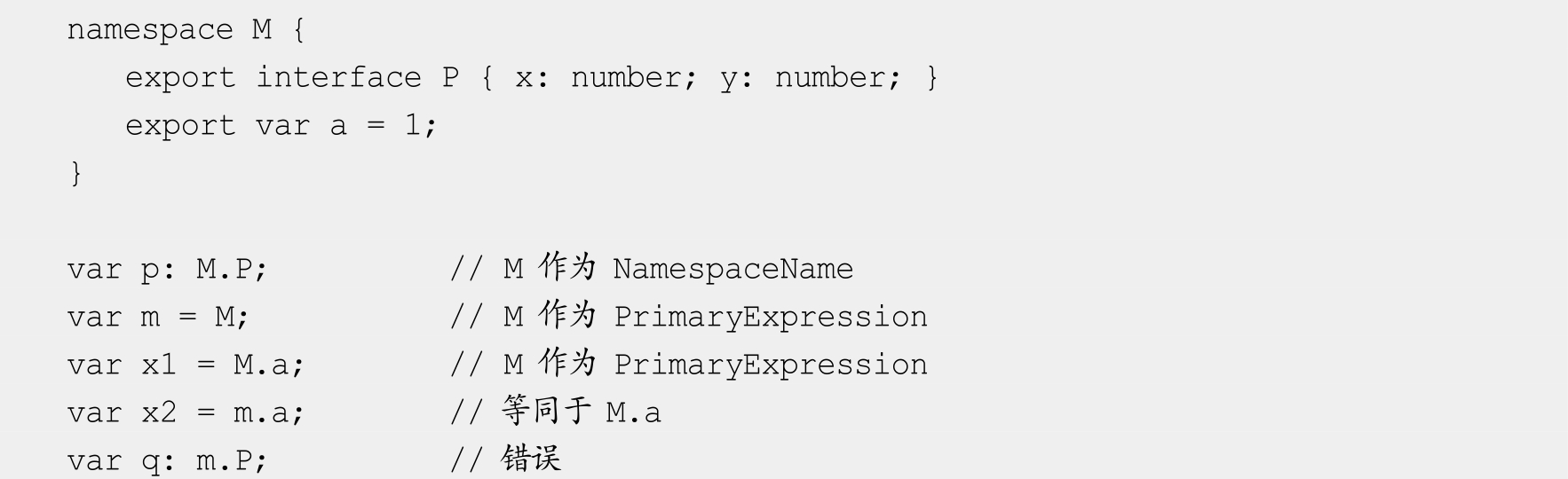 如果上面的M声明排除了导出的变量a,那么M将是一个非实例化的命名空间,将M作为PrimaryExpression引用是错误的。