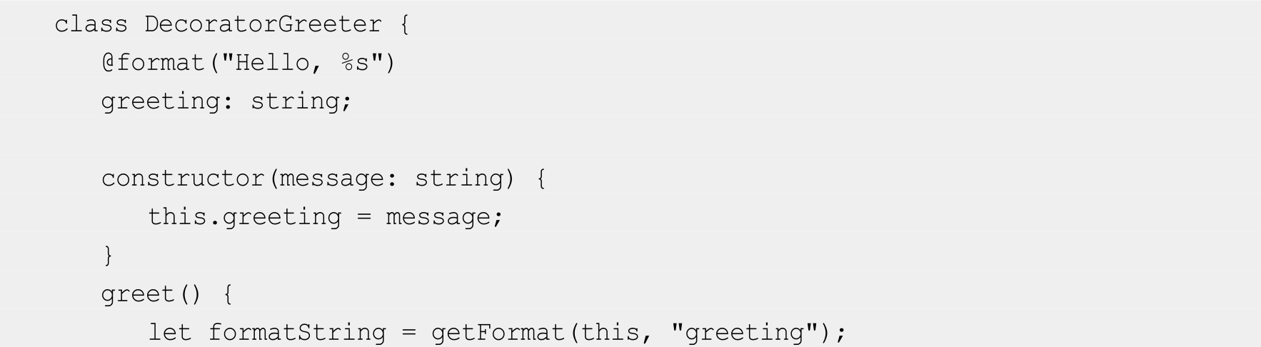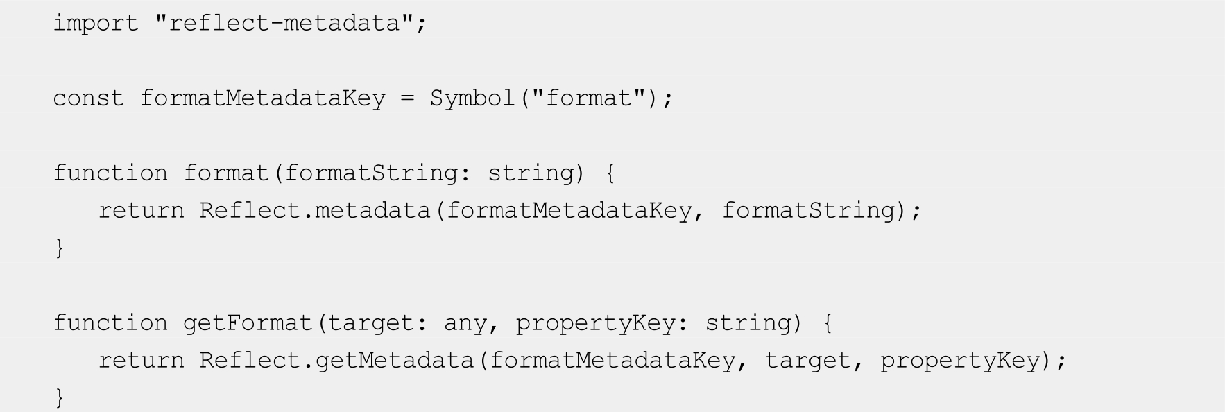 这里的@format("Hello,%s")是一个装饰器工厂。当装饰器@format("Hello,%s")被调用时,它会通过reflect-metadata库里的Reflect.metadata()函数添加一条greeting属性对应的元数据。当getFormat()函数被调用时,@format("Hello,%s")装饰器会读取到greeting属性所对应的格式化后的元数据。
