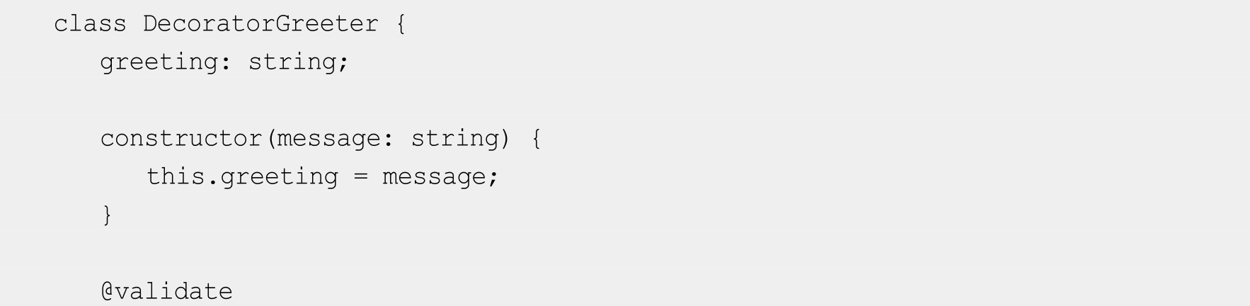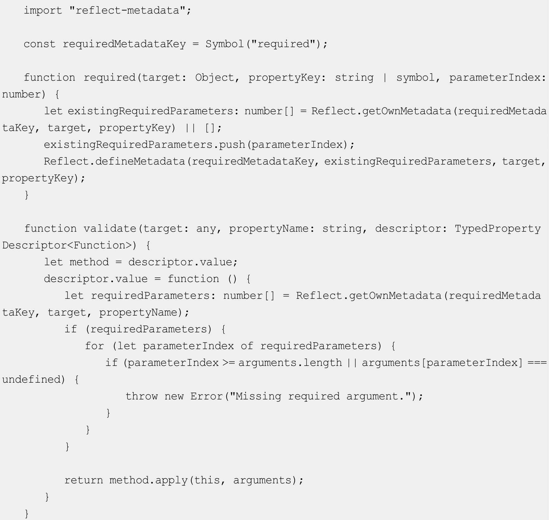 @required装饰器添加了元数据实体,把参数标记为必需的。@validate装饰器把greet()方法包裹在一个函数里,在调用原先的函数前验证函数参数。