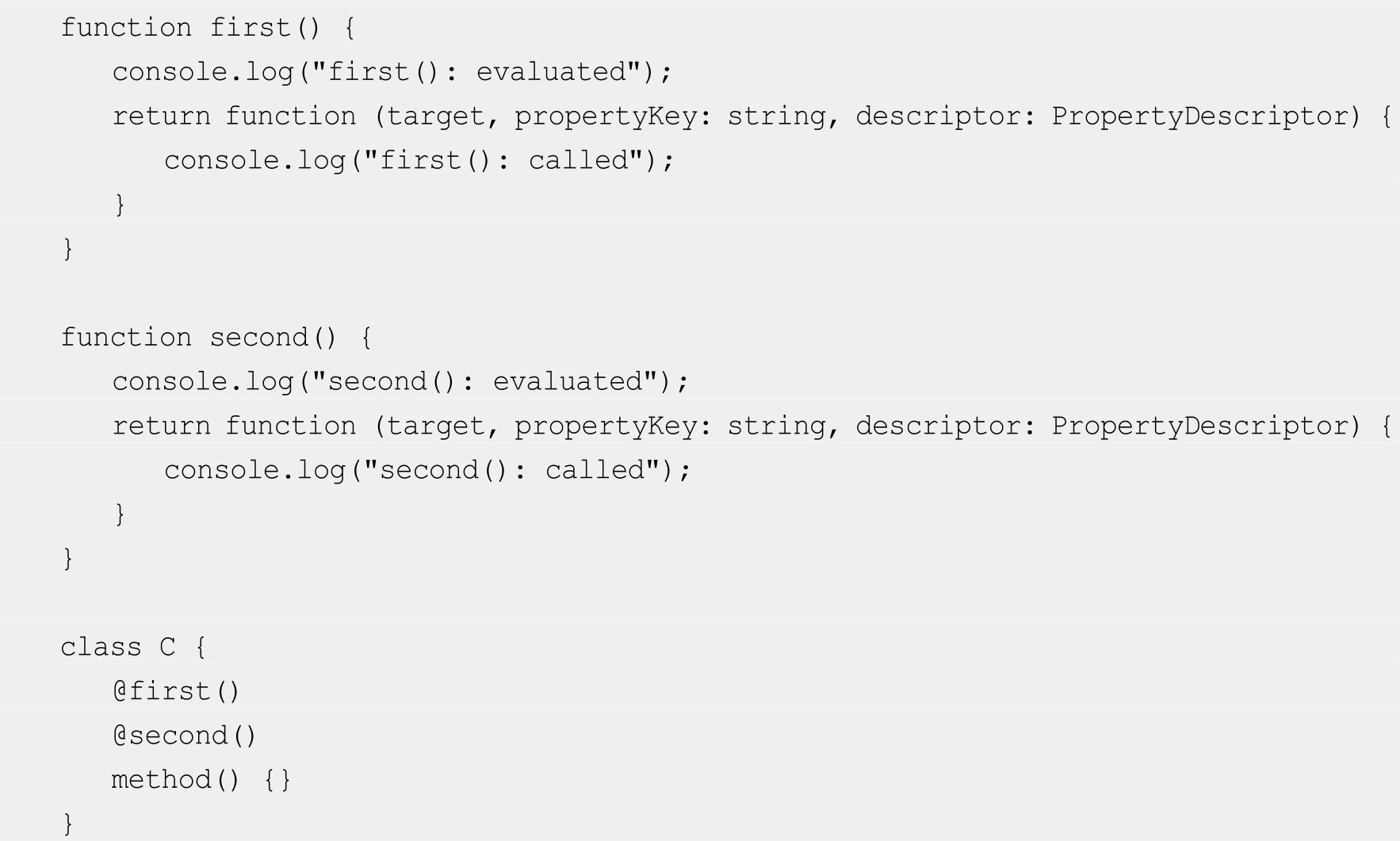 当多个装饰器应用于一个声明上时,它们的求值方式与复合函数相似。在这种情况下,当复合first和second时,复合的结果等同于first(second(x))。
