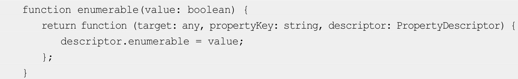 这里的@enumerable(false)是一个装饰器工厂。当装饰器@enumerable(false)被调用时,它会修改属性描述符的enumerable属性。所谓装饰器工厂,是指以工厂模式来定义装饰器,其表现为可以在装饰器中传递参数。