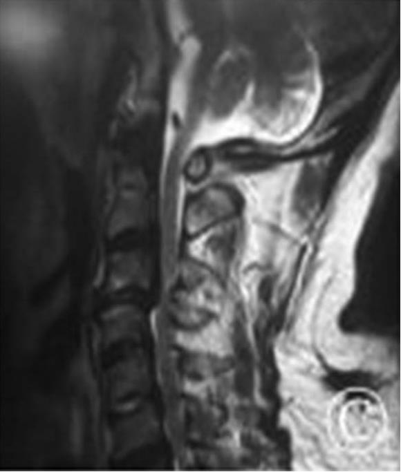 图5-3 颈椎MRI示C2/3、C3/4、C4/5、C5/6椎间盘突出,C3/4椎管狭窄,脊髓水肿,C3/4椎间盘层面脊髓损伤