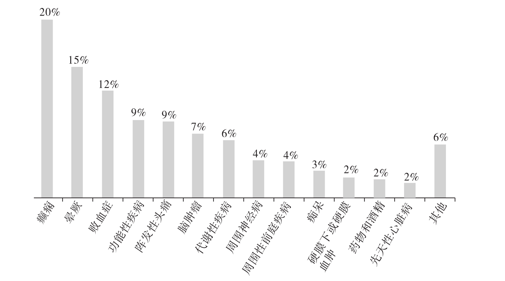 (1)甄别是否为卒中模拟病 首先应认真地进行体格检查和仔细询问病史。图5-5显示了某中心卒中模拟病疾病构成比。转换性障碍为卒中模拟病之一,Hoovers征对鉴别诊断颇有意义:让患者“瘫痪侧下肢”上抬,将手放在对侧足跟部,可感觉到足跟向下的抵抗力;可左右对照试验,为癔症性瘫痪查体的常见体征。低血糖也是卒中模拟病之一。在我院有1例患者在心内科住院期间发生急性偏瘫,检查头颅CT等准备溶栓时,发现患者血糖为1.5mmol/L,纠正血糖后症状迅速好转,之后发现有颅内动脉狭窄。