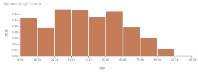 表示分布的典型图表是直方图、簇状柱形图、箱形图。图2.2.7所示的是年龄分布图。