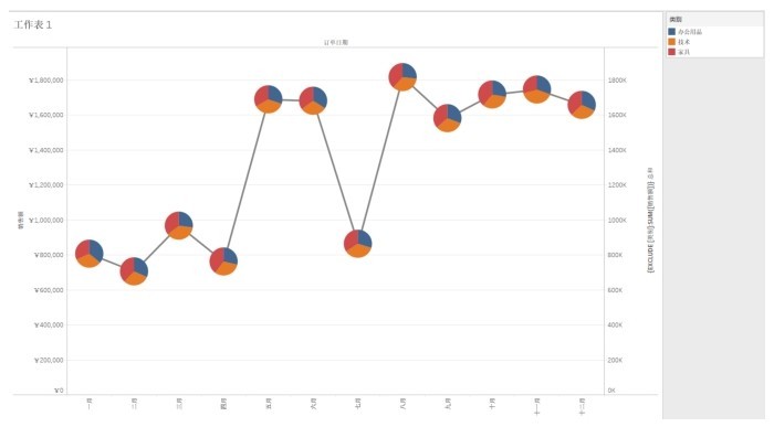 另外,Tableau可以巧妙地将不同图表组合在一起形成新的图表,其被称为组合图。组合图的强大之处在于在原有图形上增加了额外的维度展现,使数据更具洞察力。例如图2.2.1所示的是折线图和饼图的组合,折线图展示每月的销售额,饼图则展示每月销售额中各类产品的占比。