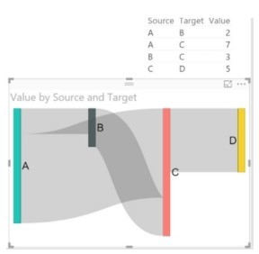 表示数据流动的典型图表是漏斗图、琴弦图、瀑布图等。这类图表用于表示不同种类间或不同流程间数据的动态流动。如图 2.2.5所示,这里表示A、B、C、D四个节点之间数据的流动。