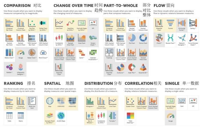 Power BI大师Marco Russo将Power BI中的主流图表分为9大类,并制作了Power BI Visual Card(中文名称暂且定为Power BI视觉览胜图),如图2.2.2所示。