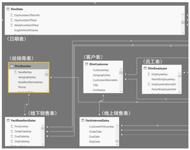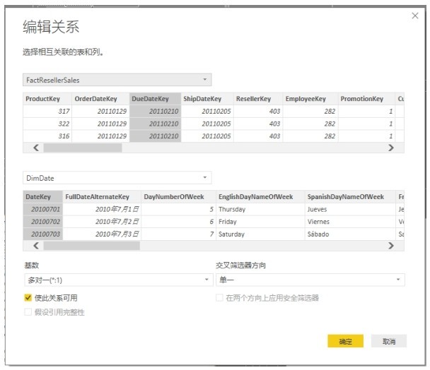 在日期表与其他事实表的联接中,有实线联接,也有虚线联接。在线下销售表(事实表)与日期表之间存在3条关系链,分别为OrderDateKey(订货日期键)、DueDatekey(到期日期键)和ShipdateKey(发货日期键),其中DueDatekey为实线联接,其余为虚线联接。在此可以将实线联接比喻为开了水闸的河道,溪水从此流过。可以将虚线联接比喻为关了闸的河道,水流无法通过。