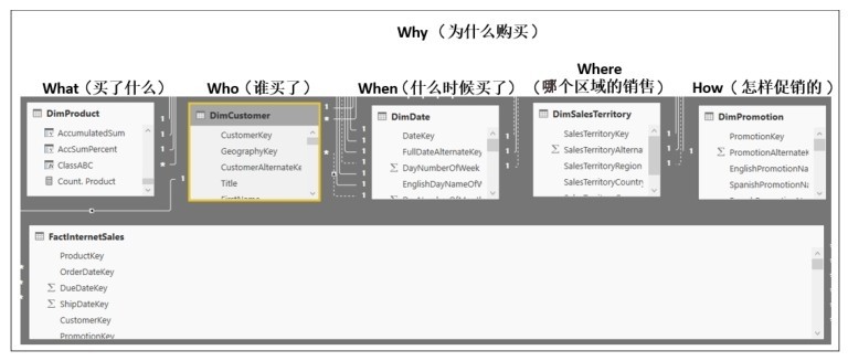 虽然Power BI具有数据表自动关联的功能,但是这不代表设计者可以完全依赖自动关联功能而不了解表之间的关系。设计者应该清楚表之间的关系。在真正开始建立关系前,先在脑海里回答“5W1H”的问题,再在草图上勾勒表间的关系,最后才在模型中建立关系,如图3.3.5所示。