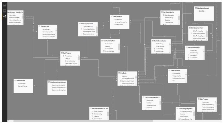 读者可以利用左下角的视图缩放功能,自己摆弄一下表格的位置,看看能不能把所有的表格都拖曳到视图里并且码放得更有条理一些?笔者习惯把维度表放置在视图的上方,将事实表放在视图的下方。关系条理性清晰的视图,更方便用户理解模型的构造。