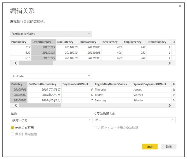单击界面中的实线,弹出的“编辑关系”对话框中会显示两张表彼此的联接关系,勾选“使此关系可用”复选项代表这个关系为“激活”状态,用实线表示。虚线则表示“非激活”状态,在默认情况下,1表会通过实线关系查询多表。除此之外,基数属性定义两张表的关系,比如这里的多对一定义了经销商表和日期表之间的关系,“交叉筛选器方向”定义查询的方向,默认值为“单一”,指1表可筛选查询多表的值或者简单理解为1表控制多表。当将此选项值改为“两个”的时候,筛选逻辑变成双向,通常用于多表对多表的查询关系,如图3.3.3所示。此特殊选项只存在于Power BI中,Excel只能支持1表对多表的查询,除非使用DAX函数,才能实现双向筛选。
