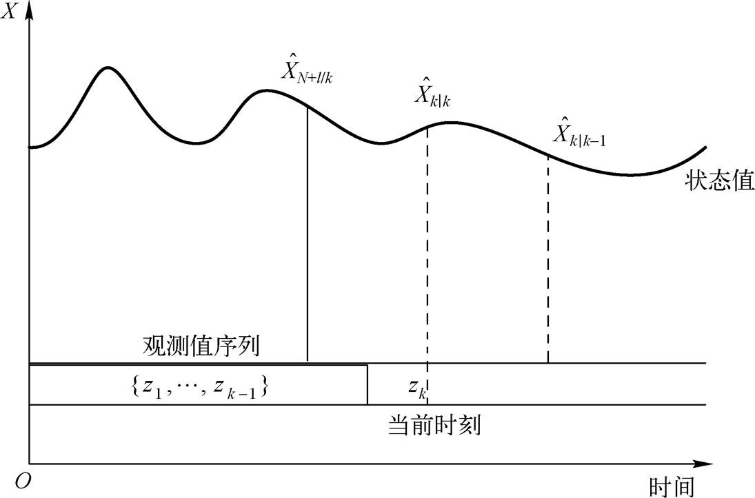 在滤波问题里,所依据的观测数据是有限的。根据这些观测数据,不可能完全消除随机误差,一般只能依据一定的准则来估计目标的运动状态,一般称为状态的最优估计。根据所估计目标状态对应的时间点,该最优估计可分为平滑、滤波和预测估计,如图1.5所示。