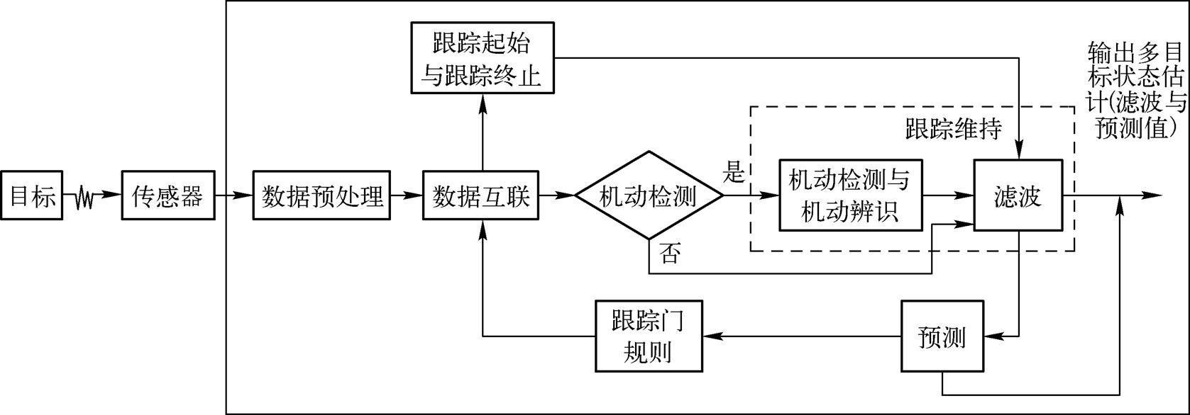 单目标跟踪涉及目标坐标系的选择、观测数据预处理、目标运动模型建模、机动检测与机动辨识、滤波与预测等主要步骤,如图1.2所示。与单目标跟踪相比,多目标跟踪还需要考虑数据互联、跟踪门规则、跟踪起始和跟踪终止等内容,如图1.3所示。