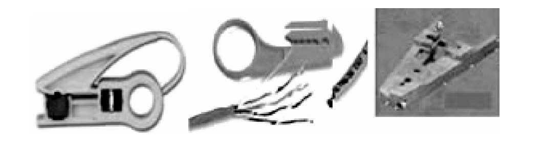 在双绞线网线制作中,最简单的方式只需一把网线钳,如图2.3所示。它具有剪线、剥线和压线三种用途。在选用网线钳时要注意选择种类,因为针对不同的线材,会有不同规格的网线钳,一定要选用双绞线专用的网线钳才可用来制作以太网双绞线电缆。三种常见的剥线钳如图2.4所示。