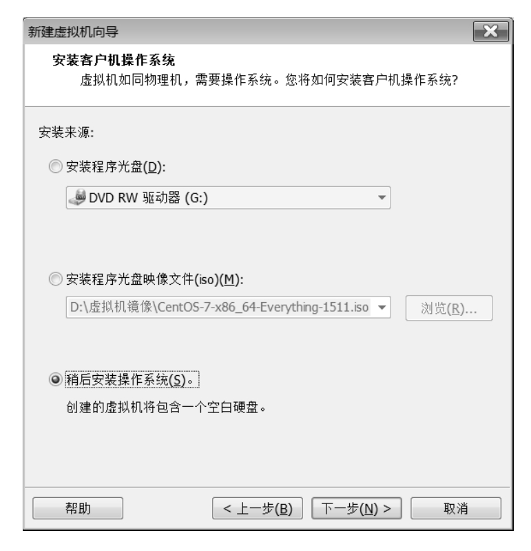 单击“下一步”按钮进入“安装客户机操作系统”界面,这里选择“稍后安装操作系统”。如果选择“安装程序光盘”或“安装程序光盘映像文件(iso)”,那么 VMware会帮助用户自动安装一个最小化的 Linux操作系统,安装过程完全不用用户参与。这样做的好处是安装简单,适合初学者;坏处是完全不能干预安装过程,包括系统分区过程等,就失去了学习的意义,所以选择“稍后安装操作系统”,如图 2-4所示。
