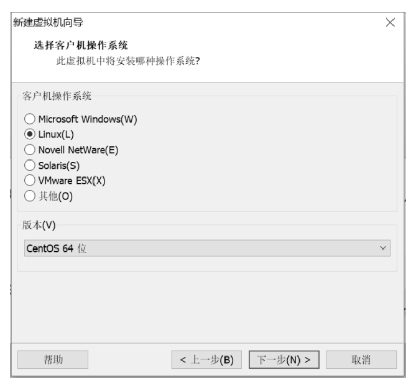 单击“下一步”按钮,进入“选择客户机操作系统”界面,选择“Linux”,然后在“版本”下拉列表框中选择要安装的对应的 Linux版本,这里选择“CentOS 64位”,如图 2-5所示。