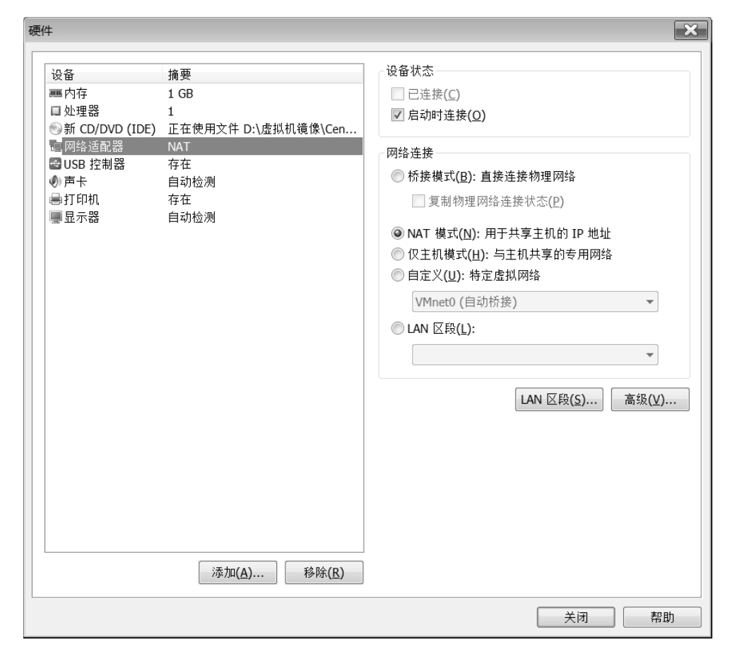 其中常用设置为:一种情况是需要宿主机的 Windows和虚拟机的 Linux能够进行网络连接,使用“桥接模式”(桥接时,Linux也可以访问互联网,只是虚拟机需要配置和宿主机 Windows 同样的联网环境);另一种情况是需要宿主机的 Windows 和虚拟机的Linux能够进行网络连接,同时虚拟机的 Linux可以通过宿主机的 Windows连接互联网,使用“NAT模式”。