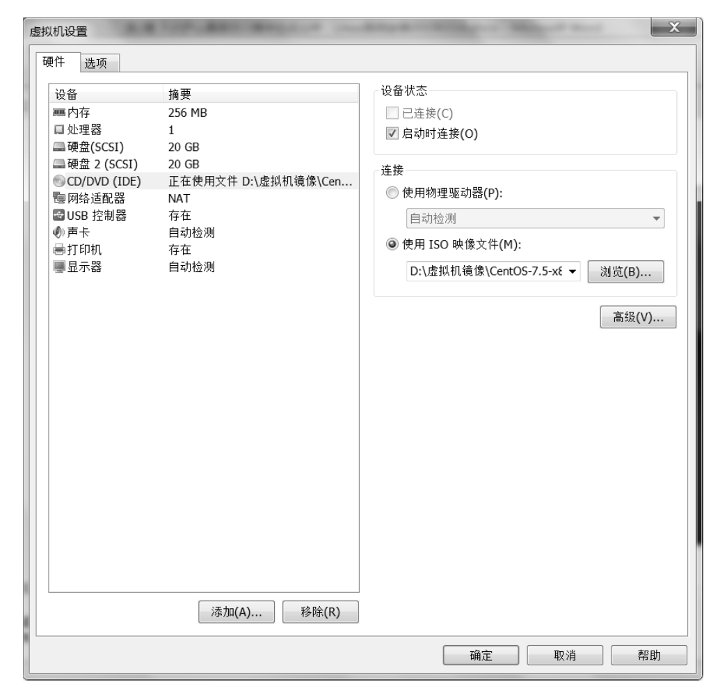 选择“新 CD/DVD(IDE)”可以选择光驱配置。如果选择“使用物理驱动器”,则虚拟机会使用宿主机的物理光驱;如果选择“使用 ISO 映像文件”,则可以直接加载 ISO映像文件,单击“浏览”按钮找到 ISO映像文件位置即可,如图 2-10所示。