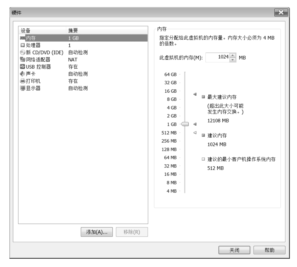 我们可以略做调整,单击“自定义硬件”按钮进入硬件调整界面。为了让虚拟机中的系统运行速度快一些,我们可以选择“内存”来调整虚拟机内存大小,但是建议虚拟机内存不要超过宿主机内存的一半。CentOS 7.x最少需要 1GB及以上内存,如图 2-9所示。
