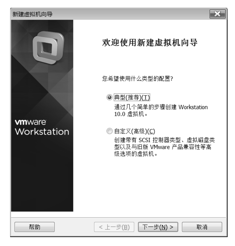 单击“创建新的虚拟机”按钮,进入“欢迎使用新建虚拟机向导”对话框,有“典型(推荐)”配置和“自定义(高级)”配置,建议新手选择“典型(推荐)”,如图 2-3所示。