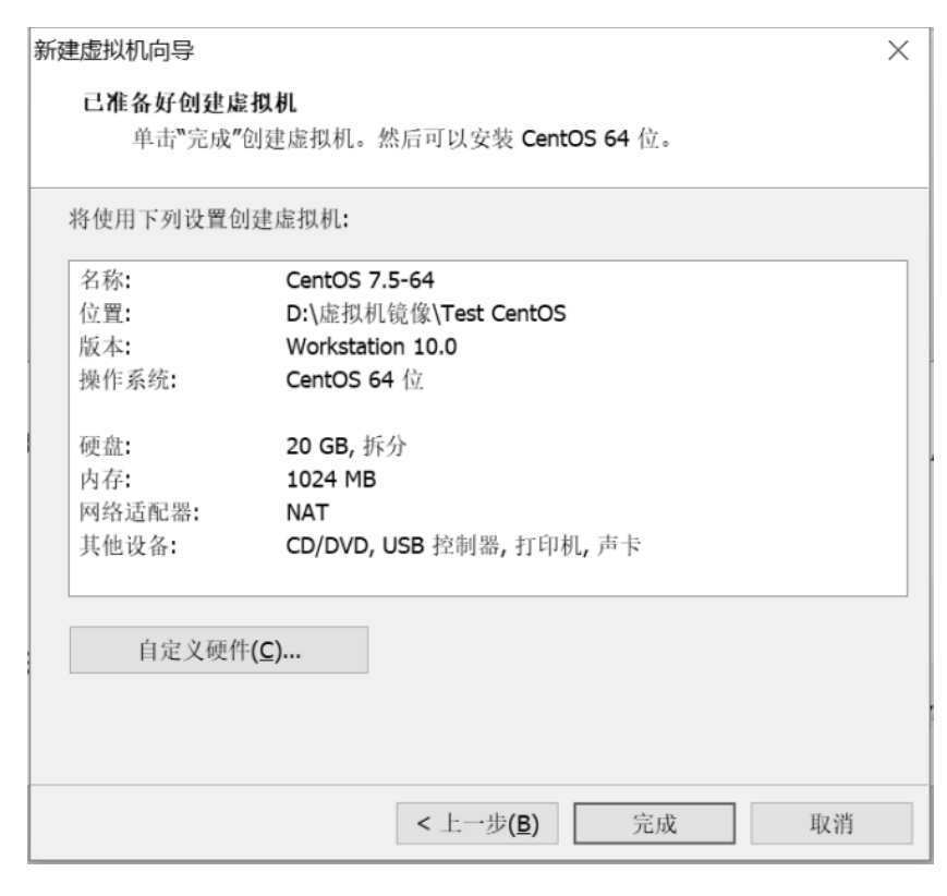 接下来进入“已准备好创建虚拟机”界面,确认虚拟机设置,不需要改动则单击“完成”按钮,开始创建虚拟机,如图 2-8所示。