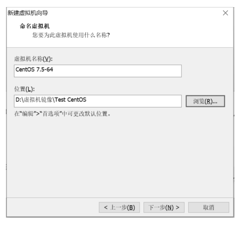 单击“下一步”按钮,进入“命名虚拟机”界面,给虚拟机起一个名字,如“CentOS 7.5-64”,然后单击“浏览”按钮,选择虚拟机系统安装文件的保存位置,如图 2-6所示。