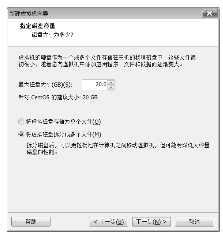 单击“下一步”按钮,进入“指定磁盘容量”界面。默认虚拟的硬盘大小为 20GB (虚拟出来的硬盘会以文件形式存放在虚拟机系统安装目录中)。虚拟硬盘的空间可以根据需要调整大小,但不用担心其占用的空间,因为实际占用的空间还是以安装的系统大小而非此处划分的硬盘大小为依据的。比如你设定了硬盘容量为 20GB,但是安装 Linux只用了 4GB,那么实际上只会在你的 Windows分区中占用 4GB的空间,占用空间会随着虚拟机系统使用的空间增加而增加,如图 2-7所示。
