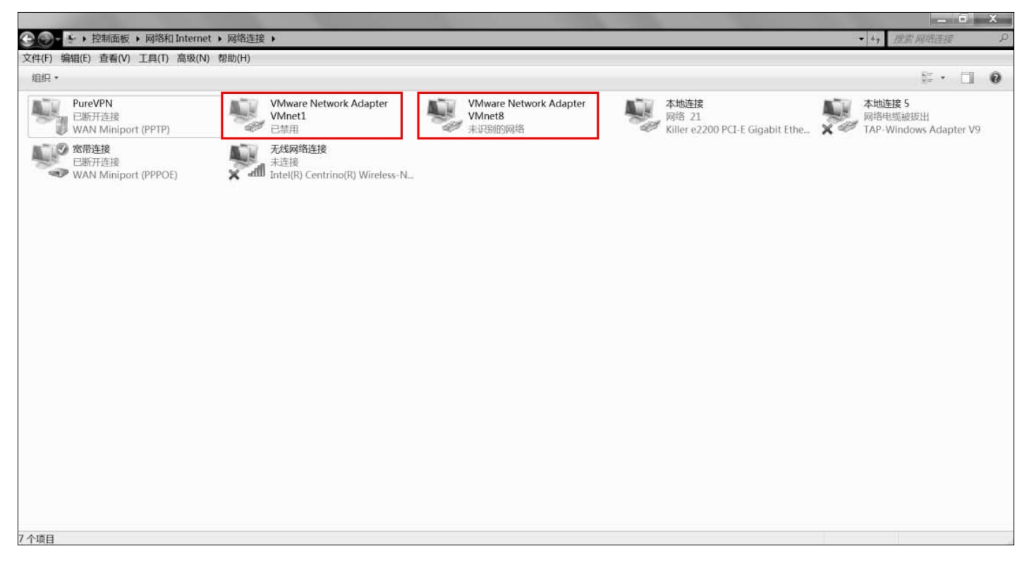 以上对于 VMware 网络的描述,读者看完了可能会有点困惑。简单总结一下:在VMware安装好后,会生成两个虚拟网卡——VMnet1和 VMnet8(在 Windows系统的“网络连接”中可以看到),如图 2-12所示。