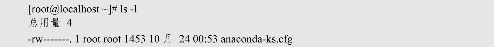 如果加一个“-l”选项,则可以看到显示的内容明显增多了。“-l”是长格式(long list)的意思,也就是显示文件的详细信息。至于“-l”选项的具体含义,我们稍后再详细讲解。可以看到选项的作用是调整命令功能。如果没有选项,那么命令只能执行最基本的功能;而一旦有选项,则可以显示更加丰富的数据。