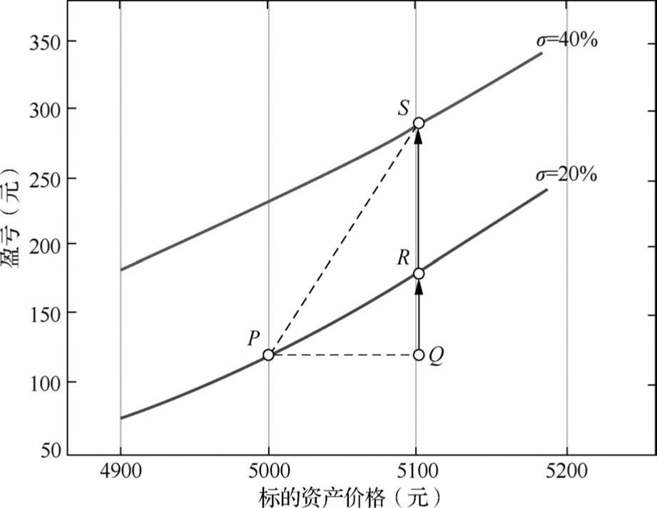 在图1.2中,当指数从5000点涨到5100点时,隐含波动率从20%涨到40%。如果不考虑隐含波动率的变化,看涨期权价格会在 P 点到 R 点之间移动。但是波动率上涨了20%,此时的看涨期权盈亏曲线自身向上偏移,最终价格并不在 R 点,而是上涨到了 S 点。当曲线自身没有偏移时,上涨幅度只有 QR ,但当波动率上涨后,曲线自身向上发生了偏移,盈亏幅度增加了RS。