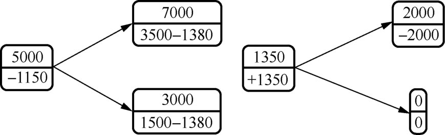 由于利率是20%,到期时要偿还的金额是1380(1150×(1+0 . 2)=1380)元。到期时,有标的资产上涨到 7000 元而认购期权价值为 2000 元和标的资产价格下跌到3000元而认购期权价值为0的两种情况。我们通过图2.3来进行分析,图2.3左边表示和股票相关的现金流,各个矩形的上半部分是股票价格或期权价格,下半部分是该时点的现金流;图2.3的右边为认购期权的价格和现金流。