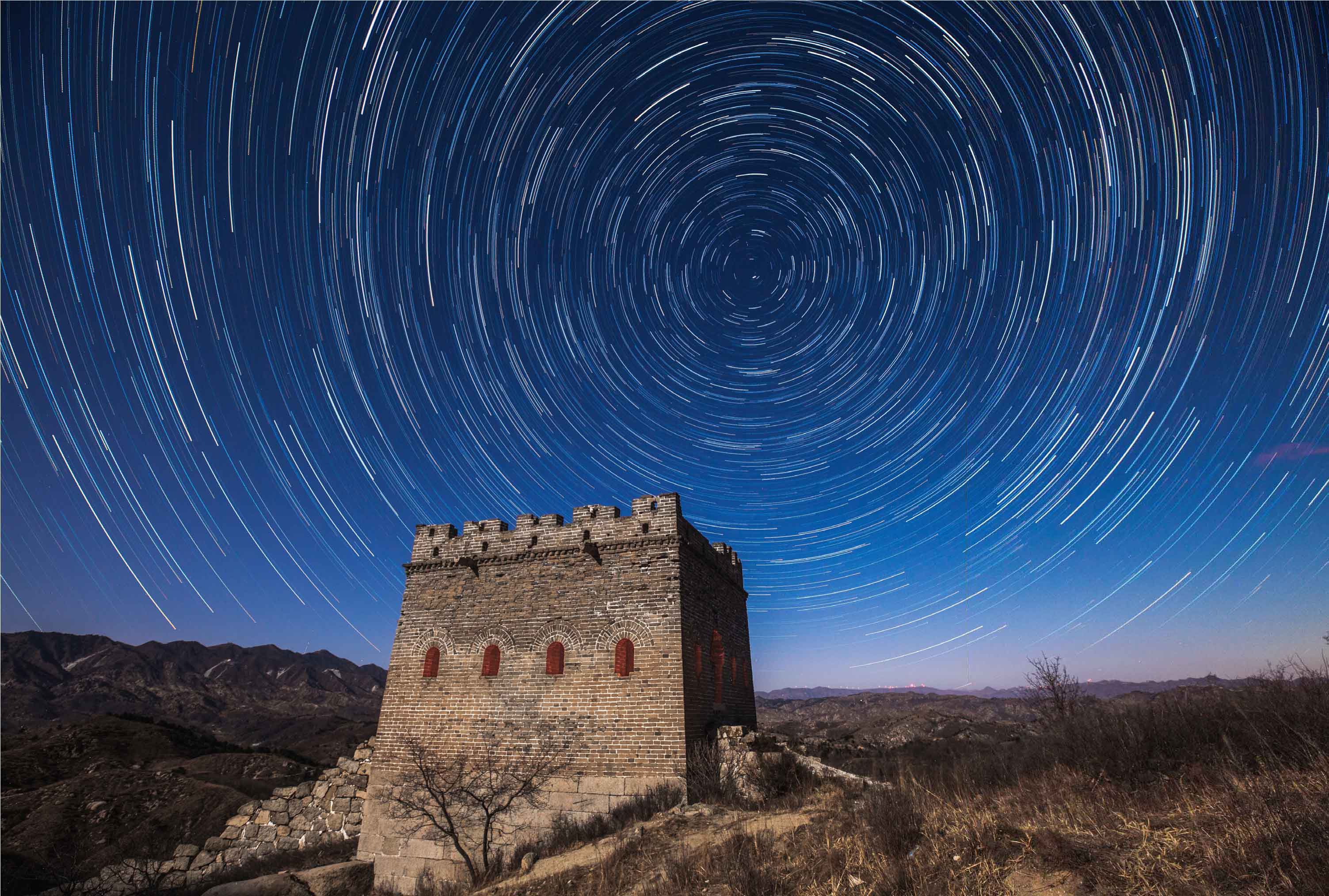 长时间拍摄时,由于相机跟随地球同步自转,星空相对于相机来说就是处于转动状态的,那么借助于长时间曝光的方法就可以记录下星空转动的轨迹。因为在地轴(极轴)延伸线上的北极星相对于地球是处于静止状态的,那么其他的星体都会绕着北极星进行转动,这样就产生了以北极星为中心的圆形轨道。