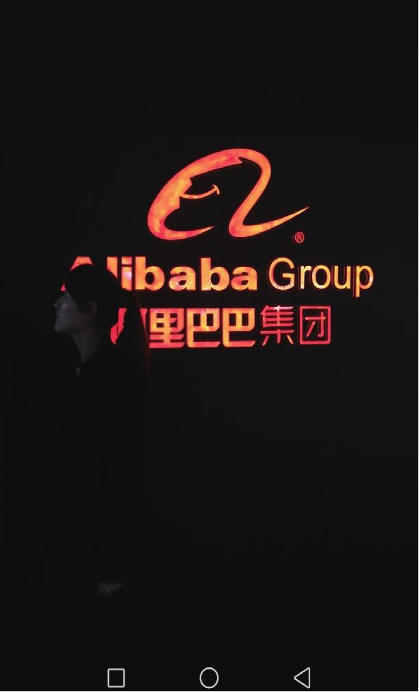 射灯投射下的阿里巴巴LOGO,手机摄于阿里巴巴西溪园区9号馆。