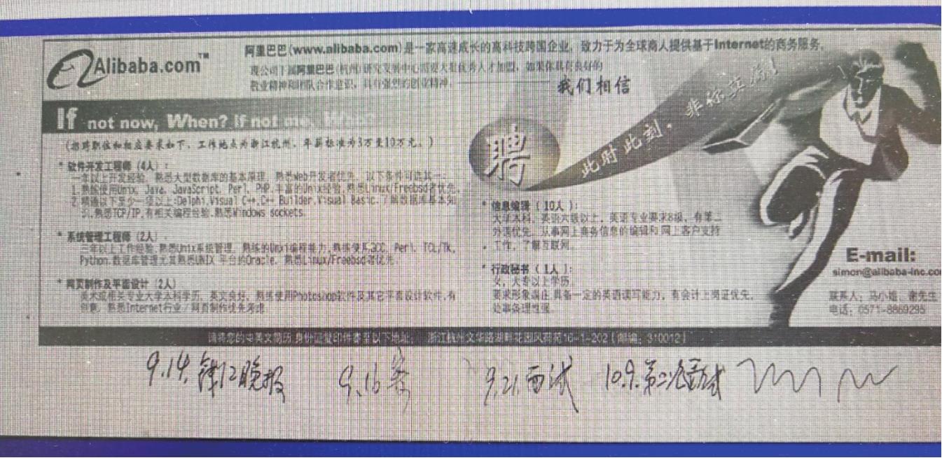 突然有年长者说,万一,以后真像马总说的那么成功,新同事将来要问起,你们拿到的第一笔风投资金干了什么,我们说大吃了一顿不好吧。吃很重要,“面子”也很重要,必须做一件事让后来者认为前辈做的是一件高瞻远瞩的事情,想来想去,他们一致认定:招人。于是,他们就去《钱江晚报》打招聘广告,去了才知道,阿里巴巴风投都拿到了,竟然还没有营业执照,于是赶紧去工商局办理,1999年9月10日拿到执照。