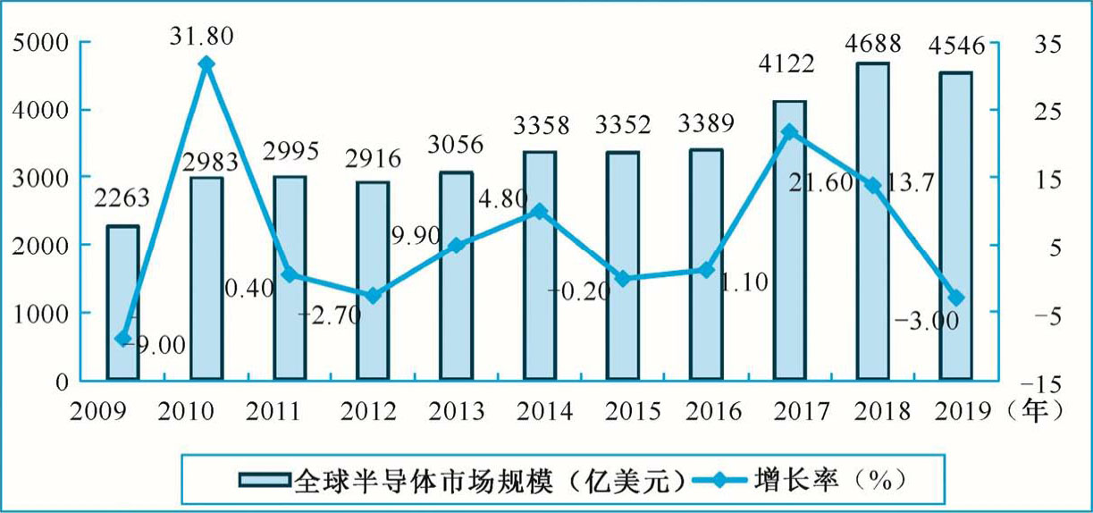 图1-1 2009—2019年全球半导体市场规模及增速预测